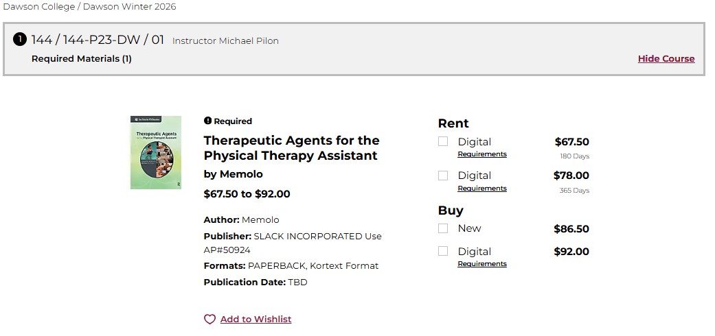 Vous pouvez également vous rendre à la librairie Concordia (Book Stop, 1400, boulevard de Maisonneuve Ouest, métro Guy-Concordia), où le matériel de cours sera disponible dans une section spéciale du magasin clairement indiquée pour les étudiants de Dawson.