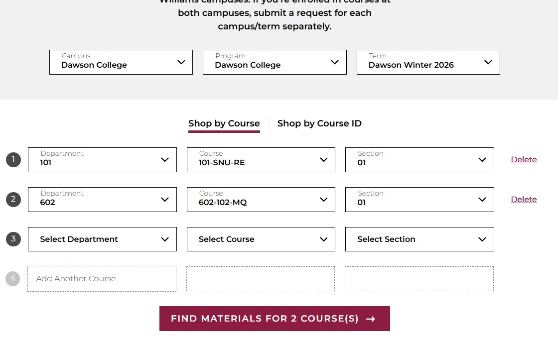 • Sélectionnez dans le menu déroulant votre département, votre cours et votre section pour chacun des cours auxquels vous êtes inscrit. Une ligne supplémentaire s'ajoutera automatiquement afin que vous puissiez saisir d'autres cours. Une fois que vous avez saisi tous les cours que vous souhaitez rechercher, sélectionnez « Trouver des ressources pour x cours ».