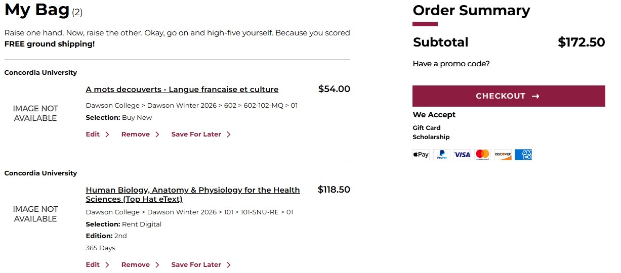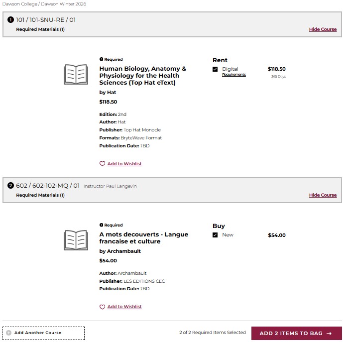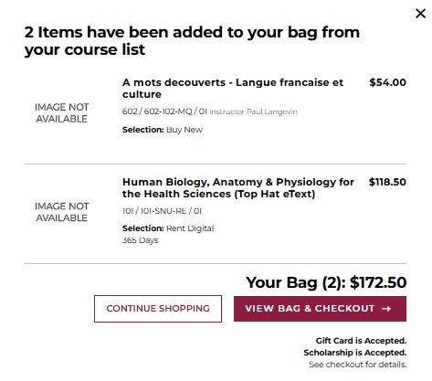 • Sélectionnez la version (neuve, d'occasion ou numérique) que vous souhaitez pour chaque livre requis pour vos cours. Cliquez ensuite sur « Ajouter les articles au panier » au bas de votre liste de livres.