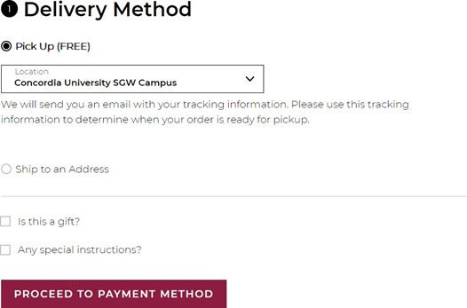 Le retrait sur le campus SGW sera la méthode la plus rapide. Vous pouvez également vous faire livrer à domicile pour un tarif forfaitaire de 7,99 $.