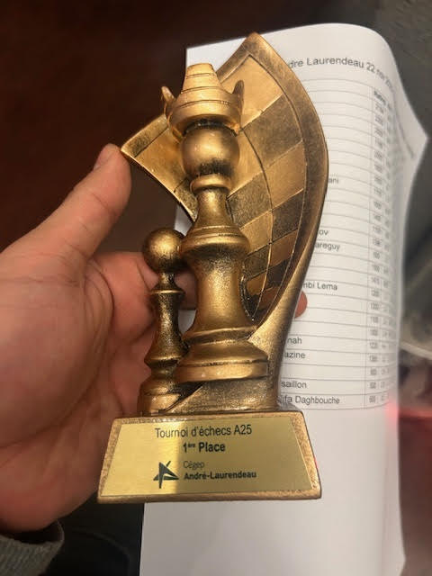 Reza Abtahian a remporté la première place lors d'un tournoi d'échecs intercollégial qui s'est tenu le 22 novembre au Cégep André-Laurendeau, où s'affrontaient des concurrent·es de huit cégeps de la région de Montréal. D'autres membres du club d'échecs de Dawson ont également obtenu d'excellents résultats: Samuel Vaccaro s'est classé 2e ex aequo, Pagna Sam a terminé 6e, Mikhail Panin 11e, Alexey Solovyev 14e et Bassma Racine 21e.