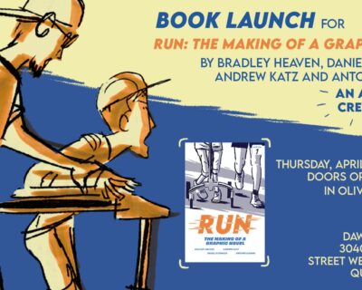 Brad et Dan, en collaboration avec Andrew Katz, auteur et professeur d'anglais à Dawson, ainsi qu'avec Antonio Luzano, illustrateur professionnel et ancien élève de Dawson, vous invitent chaleureusement au lancement de leur livre *RUN : The Making of a Graphic Novel*, qui aura lieu chez Oliver’s (2C.17) le jeudi 23 avril de 17 h à 19 h.
