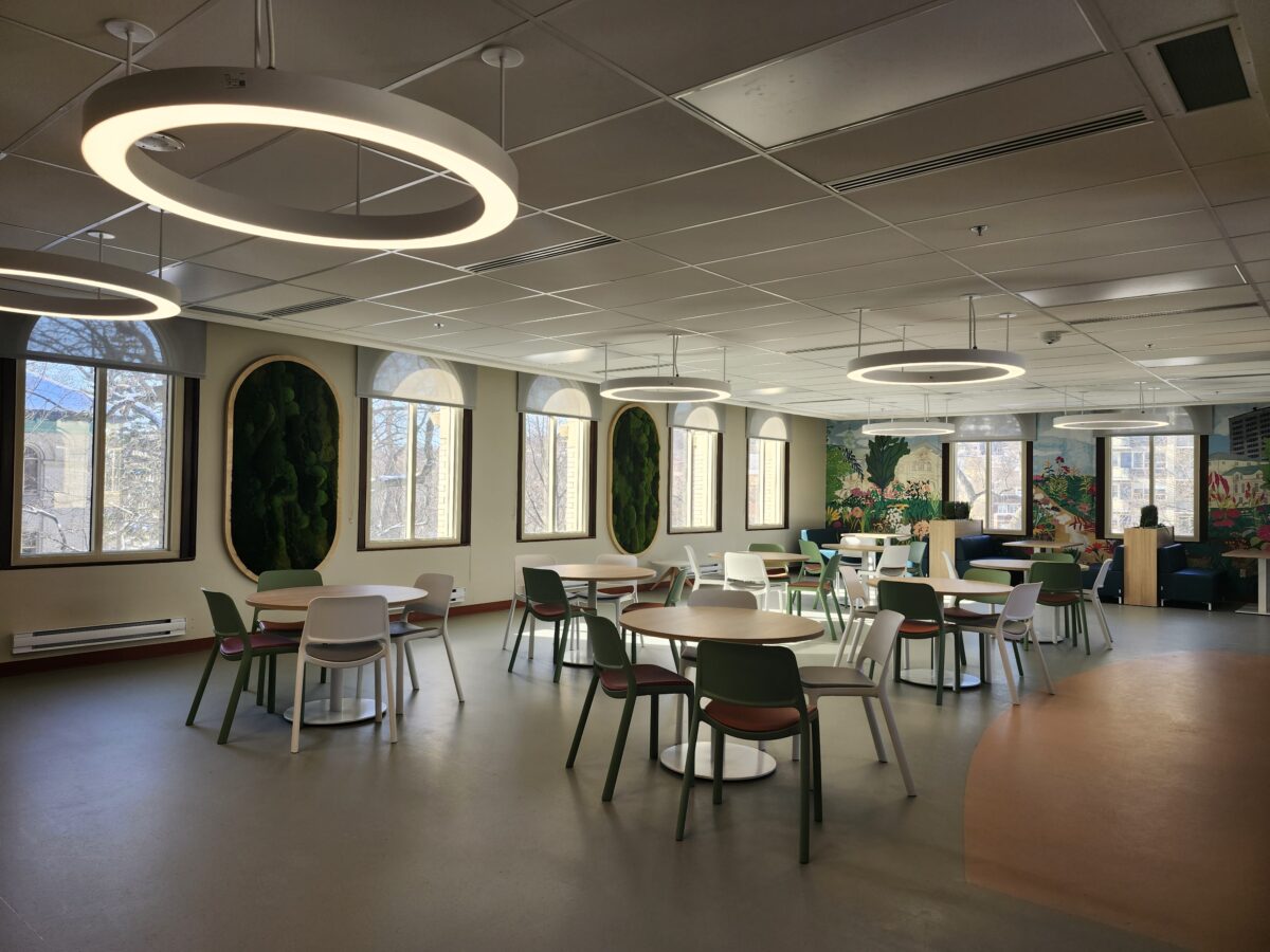 Situé au sixième étage, dans l'ancien local du programme de soins infirmiers (6B.1), le salon est un projet du service des ressources matérielles, qui a transformé un espace sous-utilisé en lieu confortable et fonctionnel.