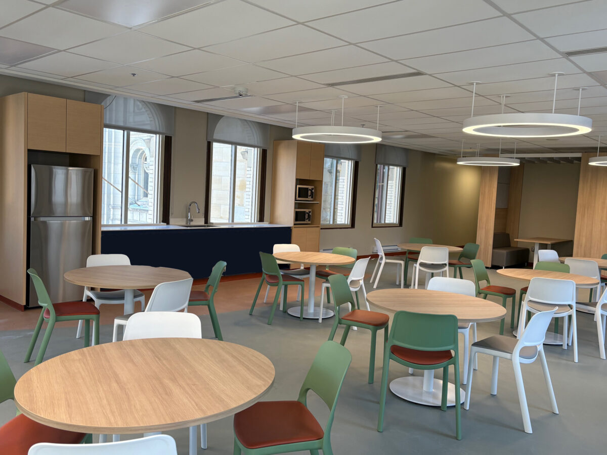 Situé au sixième étage, dans l'ancien local du programme de soins infirmiers (6B.1), le salon est un projet du service des ressources matérielles, qui a transformé un espace sous-utilisé en lieu confortable et fonctionnel.